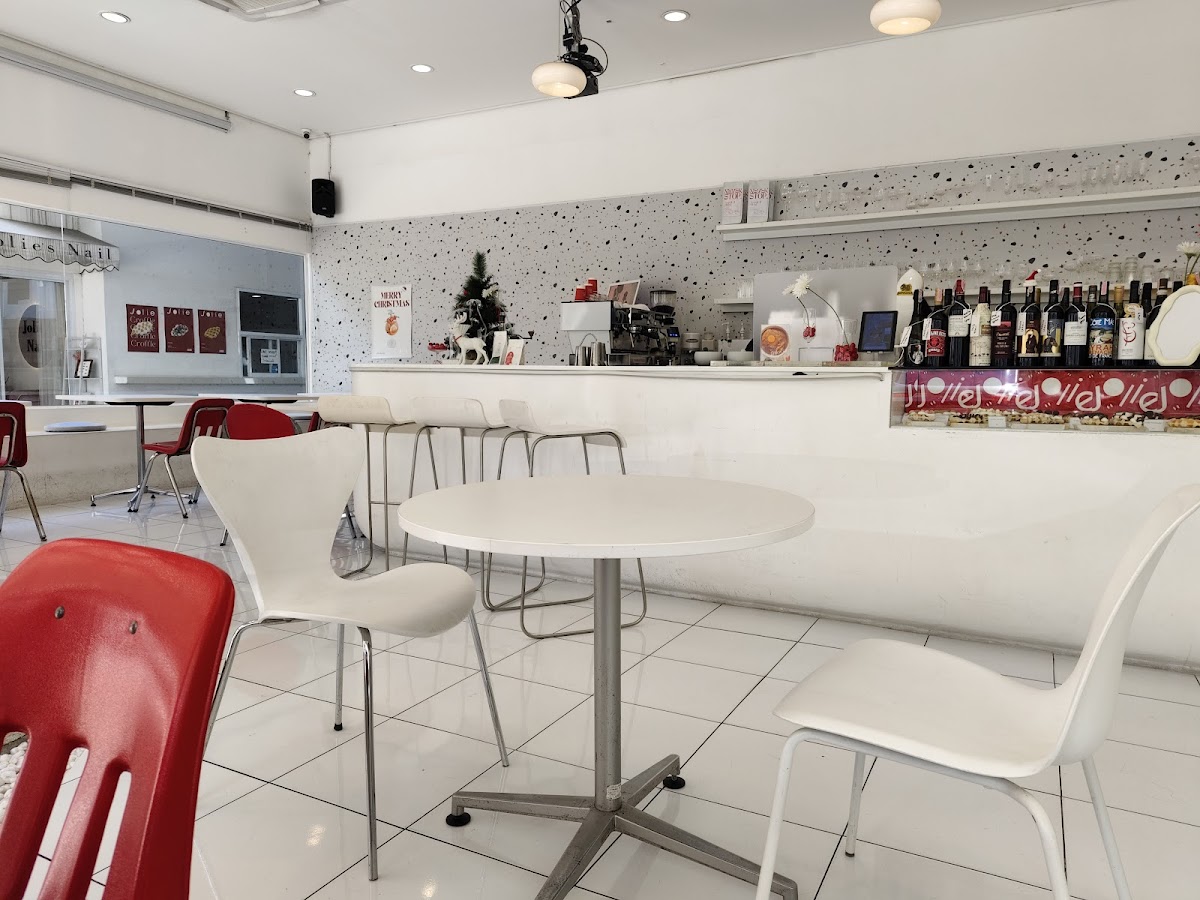 The interior combines white and red tones for a clean, somewhat photogenic look that feels open rather than cramped—a welcome contrast to the narrow soi it’s tucked inside. It’s spacious enough to handle groups and casual meet-ups alike, making it a predictable, low-key place to raise a bottle or sip coffee on a weekday.